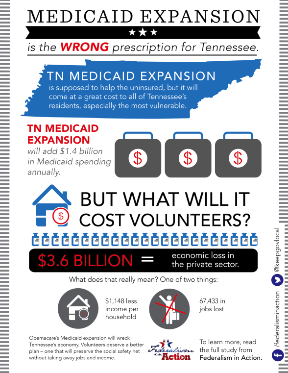 Again, they say this as if it is new money that didn’t already exist somewhere. In reality, that money existed in the pockets of other residents, who shelled it out in taxes, or it is borrowed money that will never make it into the pockets of our children and grandchildren. Every time government spends money—including to expand Medicaid—it spends your money. Government doesn’t have money; it all comes from you. While some, such as multi-billion dollar hospitals, will get a financial windfall from a Medicaid expansion, other taxpayers will have less money as a result. Studies that analyze the full picture show a Medicaid expansion in Tennessee would cost the average household $1,148 in income, or cost more than 67,000 Tennesseans their jobs. That doesn’t sound like an economic boon to me.
